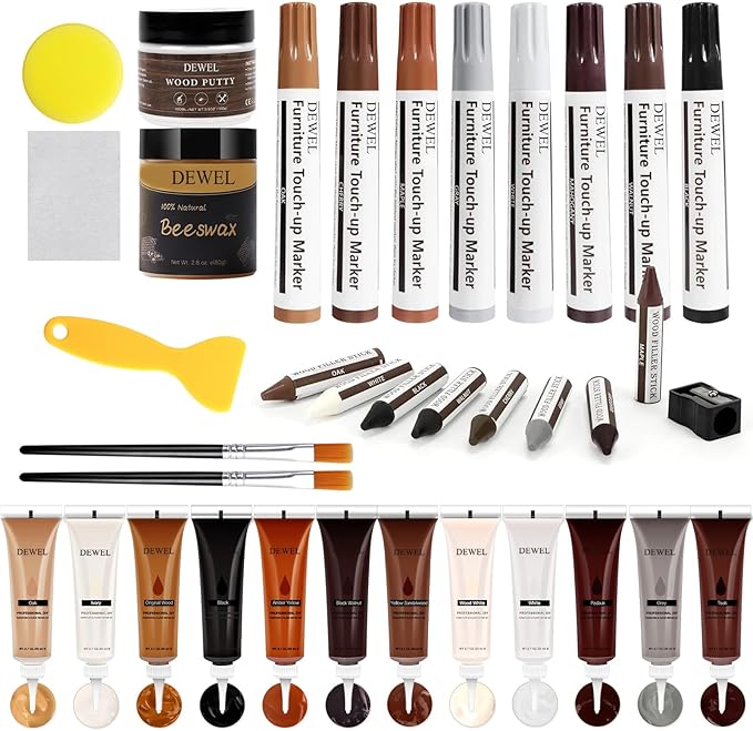 DEWEL フローリング 補修 家具 補修クリーム 補修ペン 補修クレヨン フローリング 穴埋めパテ 蜜蝋 木製品キズ補修セット 木工用パテ フローリング ドア 剥がれ 補修 家具補修 家具 傷隠し ペン ネジ穴、ひび割れ、釘目、傷、焼灼、変色など補修 スポンジ ブラシ 芯削り器 スクレーパー サンドペーパー付き