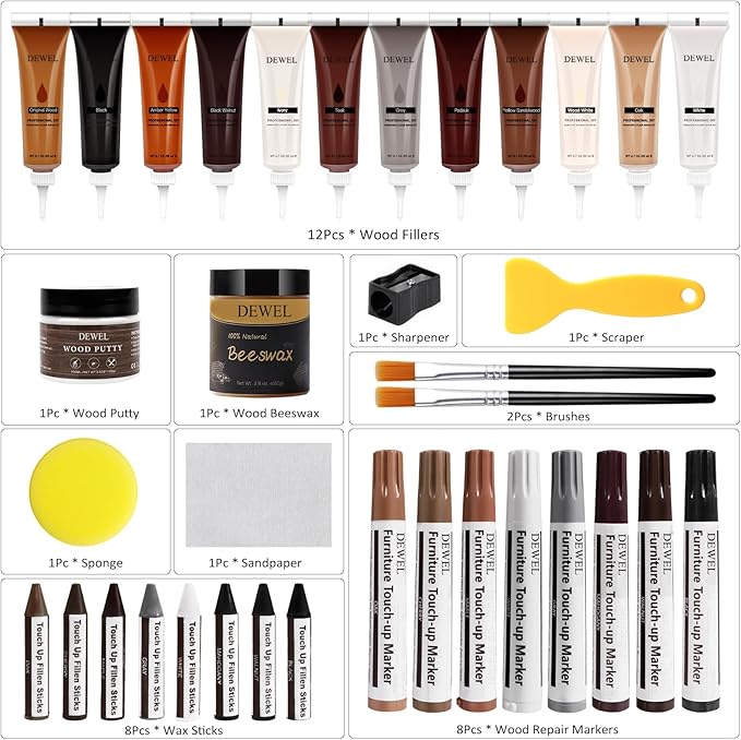 【パッケシ内容】12色補修クリーム、8本補修ペン、8本クレヨン、100g木工パテ*1、蜜蝋ワックス*1、鉛筆削り*1、スポンジ*1、サンドペーパー*1、スクレーバー*1、ブラシ*2付きます。