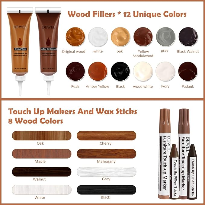 【12色入り】補修クリーム:ウッドカラー、ホワイト、オーク、ローズウッド、グレー、クルミ、ピーク、アンバーイエロー、ブラック、ウッドホワイト、アイポリー 、マホガニー。➤補修ペンとクレヨン:オーク、チェリー、メープルウッド、マホガニー、ウォールナット、グレー、ホワイト、ブラック)