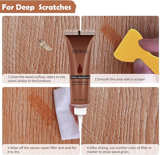 【適用範囲が広い】木製家具の細かい擦り傷、凹み傷、えぐれ傷、小さな変色、かけ、塗装剝がれ、ひび割れ、フローリングのペットがつけた傷、家具の移動や引っ越し作業による傷、飲み物をこぼしてできたシミやカビ、日々の掃除を怠って付いた汚れ、落書きを補修します。▲家具や床の色に合わせて使い分けができ、二色を混じて使えます。色んな家具の付いたキズを完璧に修復することができます。