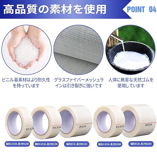 【自由にカットでき】 修補テープのサイズはご必要に応じて以下の4つからお選びいただけます。L12m*W4.8m/L12m*W8m/L20m*W4.8m L20m*W8m。補修する箇所の大きさに合わせてハサミで自由に調整できます。