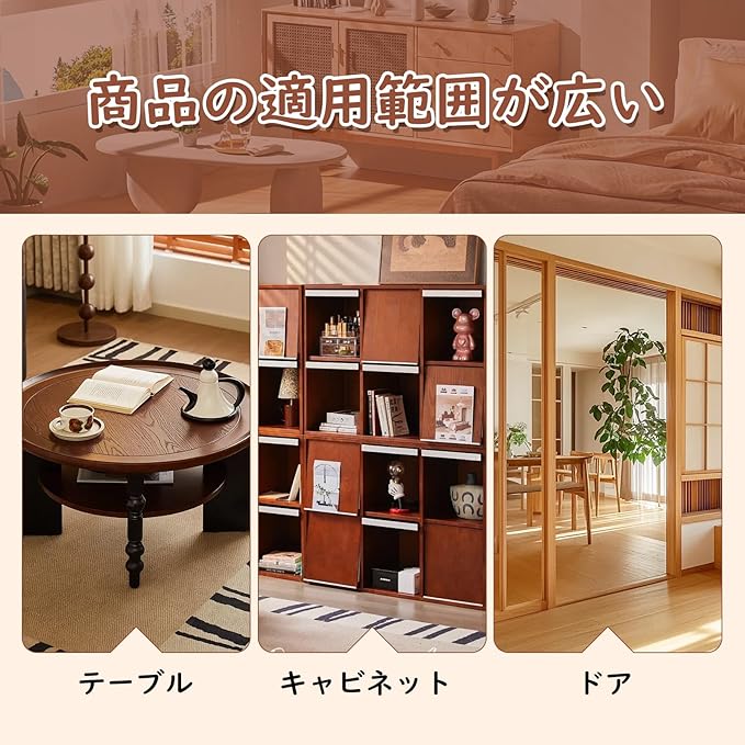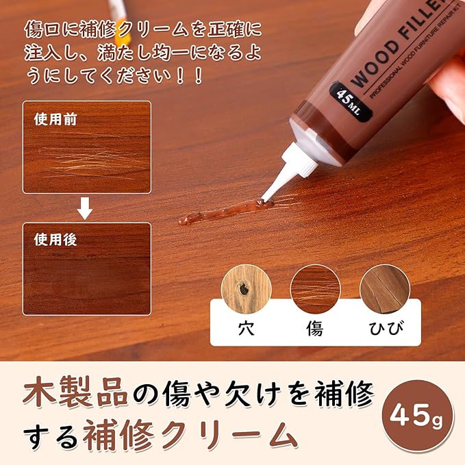 【適用範囲】本製品は、木製家具・建具全般に生じた以下のような不具合の補修・充填に最適でございます:釘跡、ひび割れ、キズなどです。▲仕上げ作のご提案:補修クリームが完全に乾燥後、色褪せ防止効果と防水性を兼ね備えたつや出しニスを塗布されることをお勧めいたします。