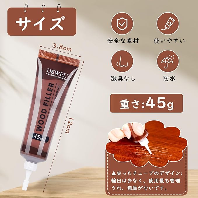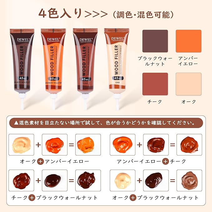 DEWEL 木製品キズ補修 フローリング 補修 補修クリーム 4色 45ML キズ直し 木工 木製の家具 ドア 床 ひび割れ 釘目 汚れ DIY ブラックウォールナット アンバーイエロー チーク オーク 調色 混色可能