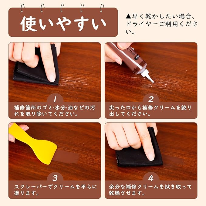 【使いやすい】①補修箇所のゴミ 水分 油などの汚れを取り除いてください。②尖った口から補修クリームを絞り出してください。③スクレーパーでクリームを平らに塗ります。④余分な補修クリームを拭き取って乾燥させます。▲早く乾かしたい場合、ドライヤーご利用ください。