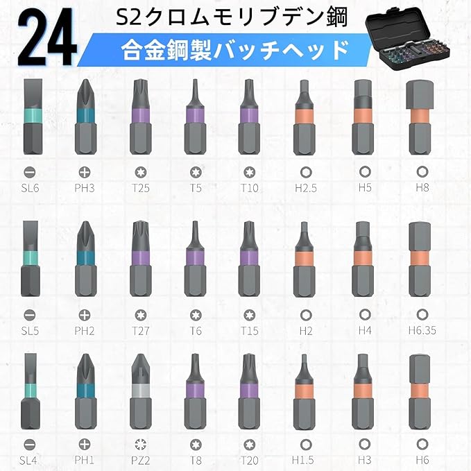 24種類の多用途ビットセット:高品質S2磁性クロームモリブデン合金鋼製の24種類のビットを同梱。家庭用DIY、自転車修理からプロのメンテナンスまで、様々な作業に対応する万能工具セットです。