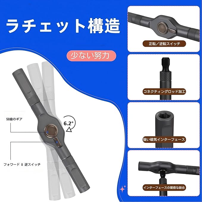 高効率ラチェット機構:精密ラチェットメカニズム搭載で前後切り替え可能。最大50Nmのトルクを実現し、従来比最大80%の省力化を実現。精密作業から力のかかる作業まで効率的に対応します。