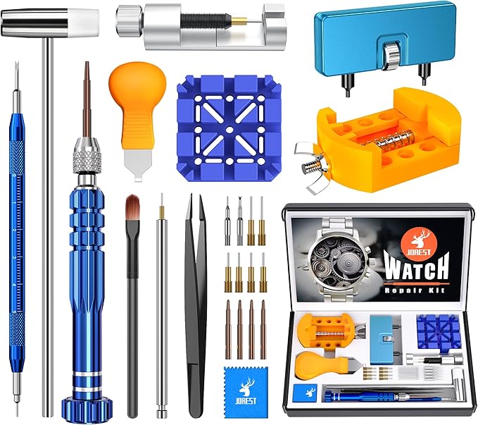 【時計修理工具キット】-- JOREST時計修理工具キットには、時計の修理に必要な一般的な工具が含まれており、時計ストラップの調整と交換、時計カバーの開封、時計の電池交換、ガスケットなど。自宅で時計の問題を解決し、高価な修理費用を節約するのに役立つ詳細な操作マニュアルがあります。