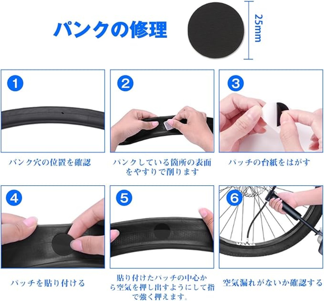 【緊急時タイヤパッチ修理】金属やすり、タイヤパッチ、タイヤレバーがついていますので、パッチで簡単に修復できます。安く済むし短時間で修理可能なので、逆に自転車屋さんへ行く手間が省けます。粘着剤不要のパッチは、修理が簡単で、急なパンクに役立ちます。