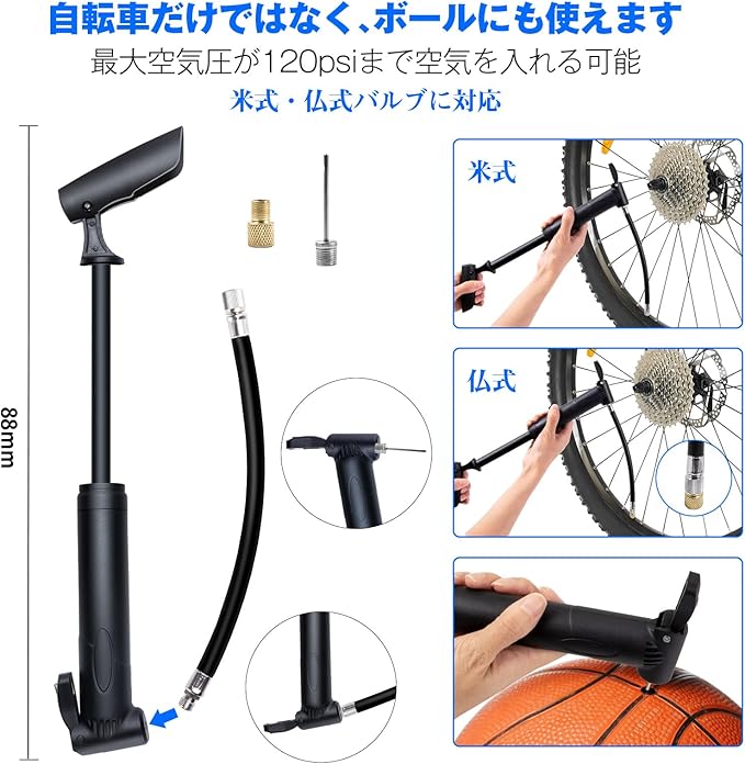【携帯空気入れ】:外出する際、パンク修理キットだけでなくミニポンプも欠かせません。最大空気圧が120psiまで充填可能。ホースも付き、力が入りやすい角度で空気を入れられるので、よりスムーズな作業が可能。また、米式・仏式のバルブに対応しているほか、ボールのアダプタもセットです。