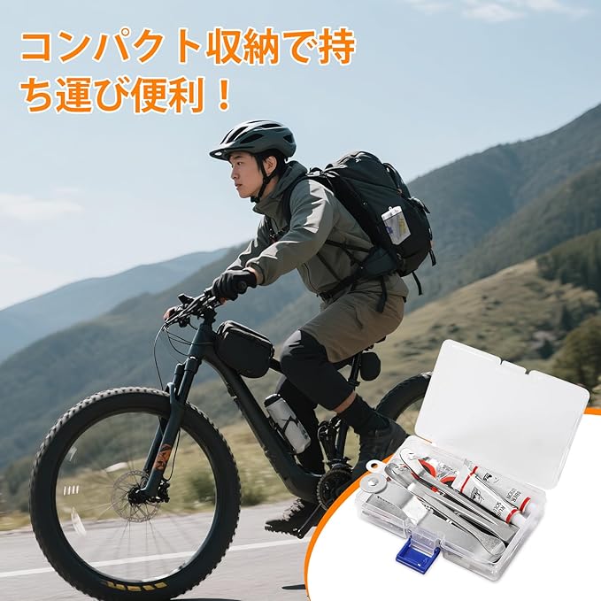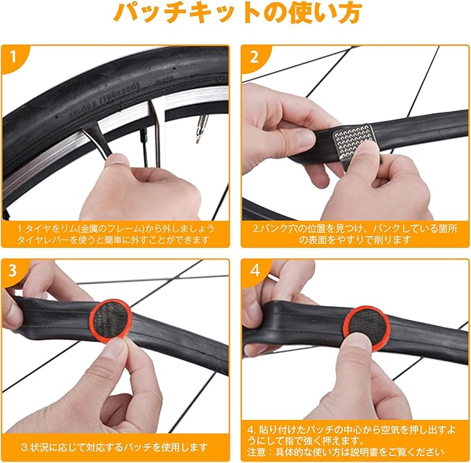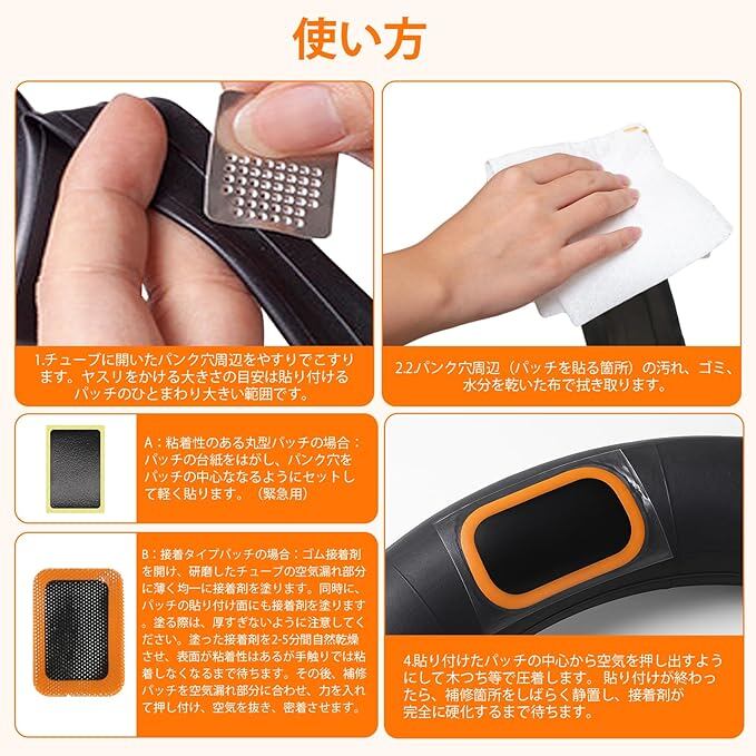 【多様なシーンで活躍する必須アイテム】この自転車パッチセットは、幅広いシーンで活躍する必須アイテムです。日常の通勤、スポーツ愛好家、bike 愛好者、自転車旅行者など、頻繁に自転車を乗る人々にとっては最適です。また、自転車のメンテナンスや修理に興味がある人にとっても大変役立ちます。簡単で使いやすい道具や材料が提供されているため、自宅でも手軽にタイヤ修理を行うことができます。初心者から上級者まで、使い勝手が良く、分かりやすい手順で修理ができるため、幅広い年齢層や技術レベルの方にも使いやすいのが魅力です。