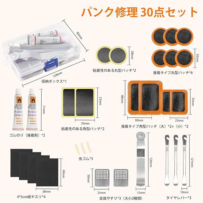 【自転車パッチセット30点】あらゆるパンクシーンに強く対応!軽量・コンパクトで持ち運び至便な自転車用緊急パンク修理キット。パンク修理キットには、修理に必要な道具が充実しています。14 枚の 2 種類のパッチ、3 本の金属製タイヤレバー、2 本のゴムのり、3 枚の金属やすり(2 種類のサイズ)、4 5cm の紙ヤスリ、3 個の虫ゴムが含まれています。通勤や通学の際、バックパックに入れておけば、自転車に乗るときも安心感が倍増します。