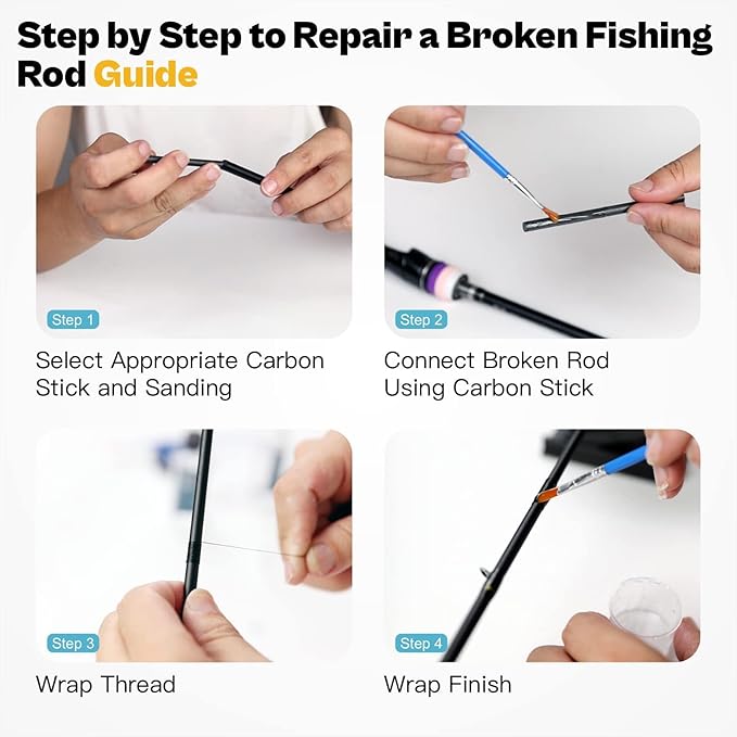 完全修理キット: カーボンファイバー補修棒、エポキシ接着剤、サンディングペーパーなど、釣り竿の修理に必要な道具が全て揃っています