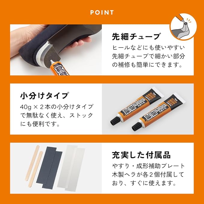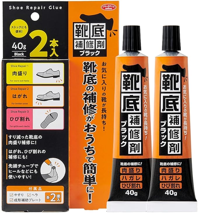 靴底のすり減り・ハガレ・ヒビ割れをおうちで簡単に補修できる靴底補修剤。補修に必要なやすり・成形補助プレート・ヘラ付きで、買ってすぐに補修できて、お気に入りの靴が長持ちします。先細チューブでヒールなどにも使いやすく、40gずつの小分けで無駄なく使えてストックにも便利!