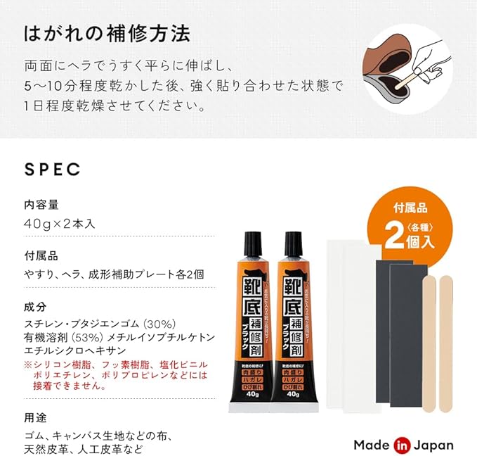 【商品仕様】正味量/40g 2本、成分/スチレン・ブタジエンゴム(30%)・有機溶剤(53%)メチルイソブチルケトン・エチルシクロヘキサン、付属品/やすり2枚・ヘラ2本・成形補助プレート2枚、用途/ゴム・キャンバス生地などの布・天然皮革・人工皮革など、接着できない材質/シリコン樹脂・フッ素樹脂・塩化ビニル・ポリエチレン・ ポリプロピレンなど、原産国/日本