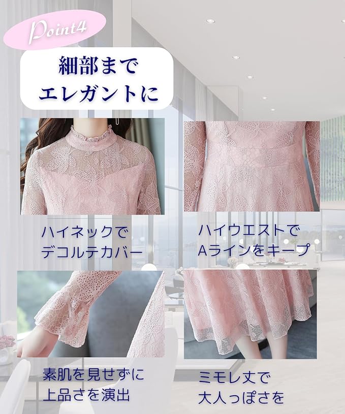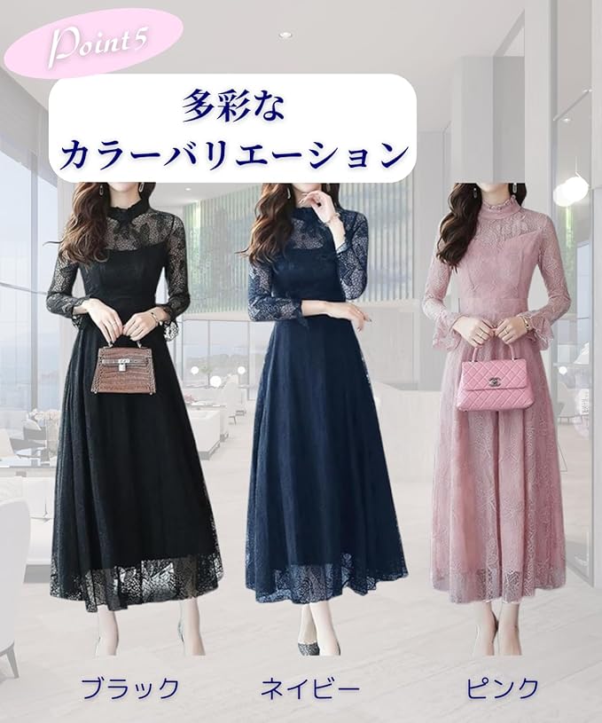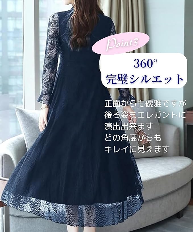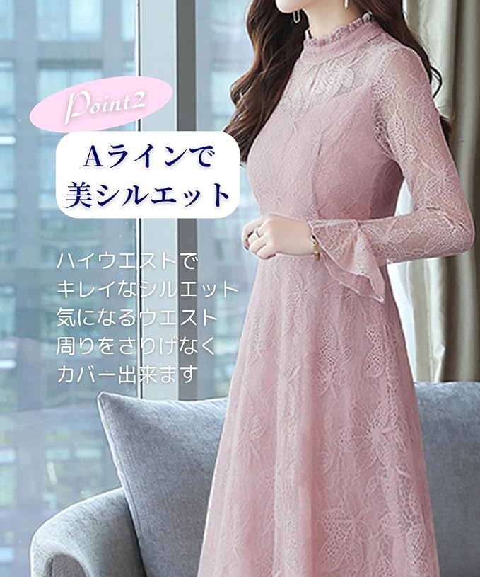 上品なデザインの総レースの大人っぽいワンピースです。お呼ばれはもちろんパーティーや結婚式などフォーマルな場面で大活躍の1枚持っていると安心なワンピースです。女子会、二次会、謝恩会、同窓会、食事会、歓迎会、通勤、通学など幅広いシーンにご着用頂けます。長袖タイプで秋から冬にかけて、そして春にかけて着用出来るデザインになっております。