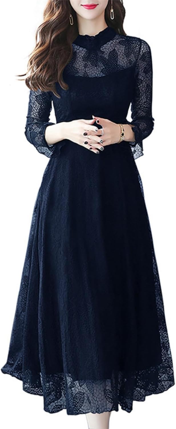 贅沢に使用された紅葉レースが、上品な揺れ感が歩く姿を美しく彩るマキシ丈ワンピースです。落ち感があり美しいフレアワンピース。マキシ丈なので、足首の細い部分のみ見せることが出来るので、脚全体が細くみえ、首元はプチ立ち襟&フリルの縁付きで可愛さをアップし、小顔効果も期待できます。長袖は総レースになっていて気になる二の腕をカバーでき、着痩せ効果バツグンのワンピースです。
