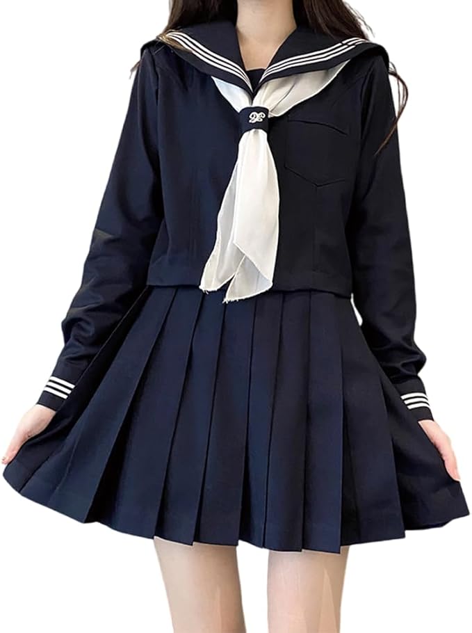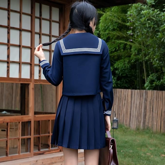 GSYCL セーラー服 紺色 女子高生 3点セット ハロウィン 仮装 JK 制服 コスチューム 長袖 前開き 上下セット プリーツスカート 人気 女子制服 本格制服 紺三本 文化祭 学园歳 卒業式 清純 可愛い ネイビー (M)