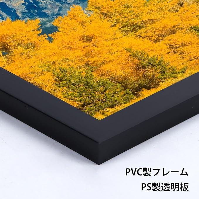 材質:PVC製フレーム、軽量で割れにくく、取り付け負担軽減安全性が高いため、家庭用やオフィス用の額縁としておすすめです。PS製透明板の高透過性 、真の色味を忠実に再現、記念写真やアート作品の展示にプロ仕様のクオリティを。