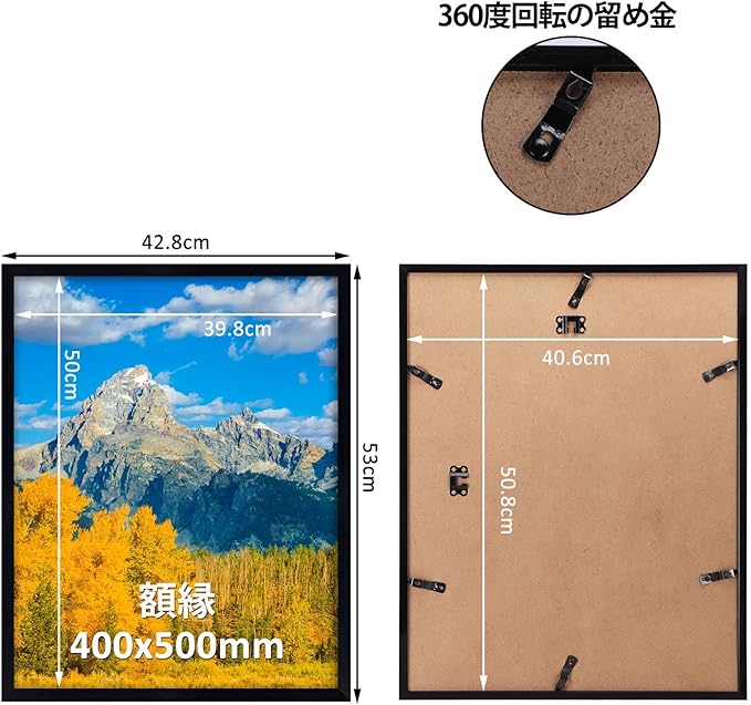 ポスターサイズで空間を彩る:外寸42.8x53cm/収納用紙サイズ40.6x50.8cm、家族写真やアートプリントを大胆にディスプレイ!リビングのメインウォールやオフィスのインテリアに最適。存在感のあるサイズで、特別な一枚を際立たせます。
