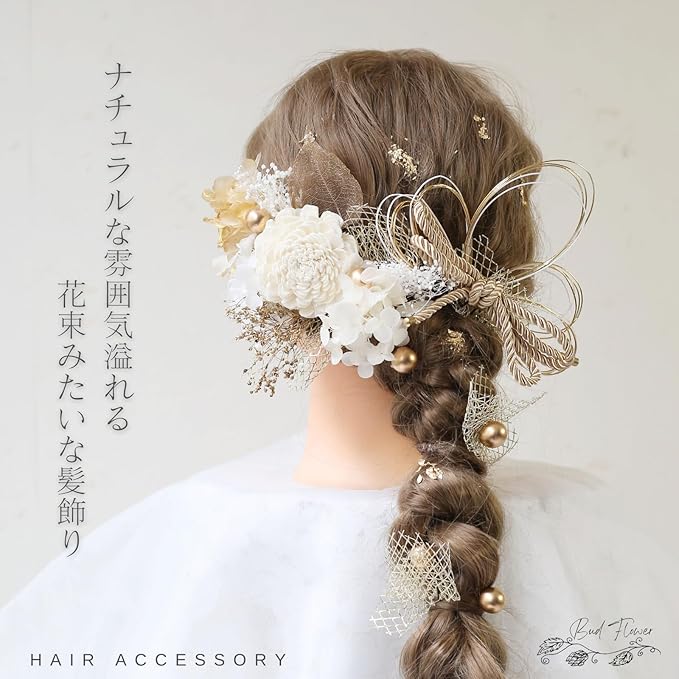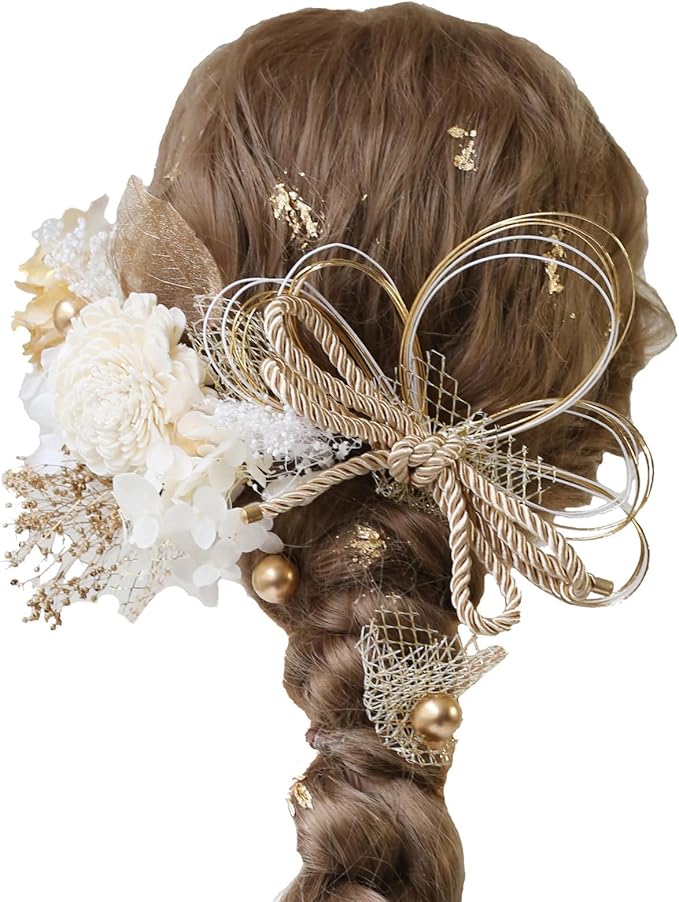 Bud Flower バドフラワー 髪飾り 成人式 卒業式 ドライフラワー 水引 金箔 和装 振袖 袴 ヘッドドレス 結婚式 七五三 アクセサリー hair-180 (ゴールド)