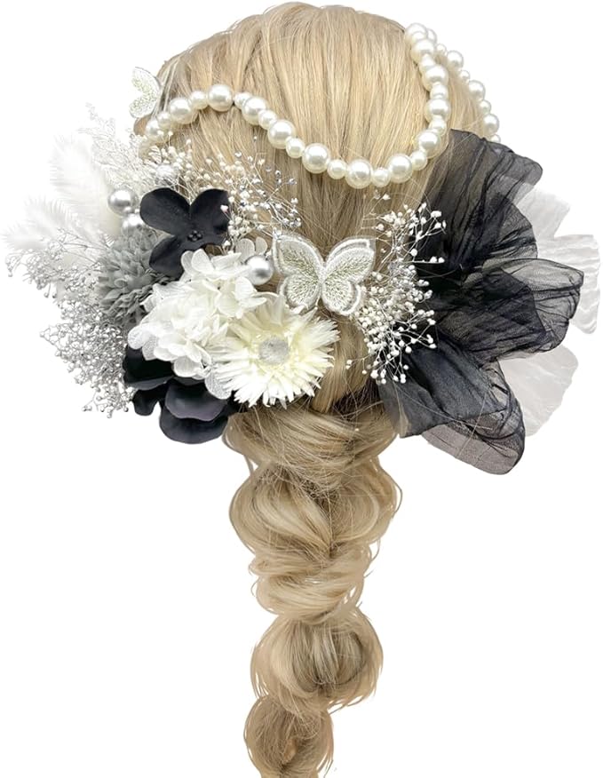 [Usasaki] 髪飾り 成人式 前撮り マム アジサイ 卒業式 入学式 カスミ草 ドライフラワー振袖 袴 ウェディング 結婚式 和装 赤 白 黒 ベリーピック パールチェーン 蝶々 ヘアアレンジ ハーフアップ ロングヘア A24110006