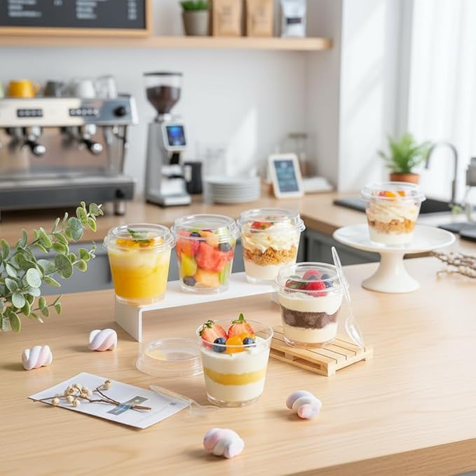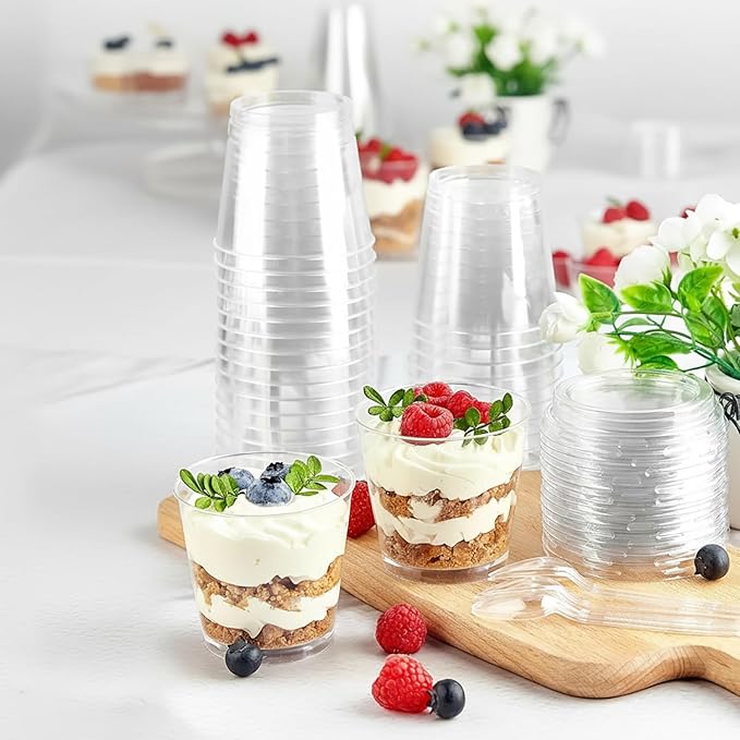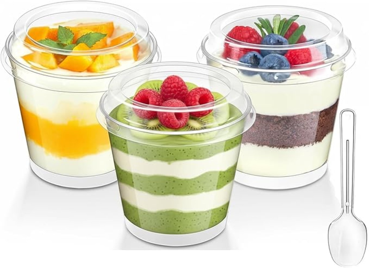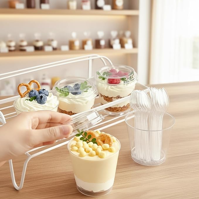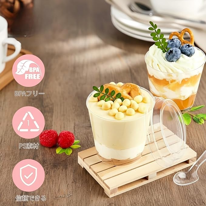 【高品質】このプリン 型、デザートスプーンはポリスチレン(PS)製で、-20℃から80℃までの温度に耐え、-20℃の冷凍庫でも安心してご利用いただけます。透明な仕上がりなので、繊細なデザートをきれいにディスプレイでき、ゲストをきっと感動させます。蓋はPET製,密閉性が良い。(注: この プリンカップ 使い捨て は電子レンジやオーブンには対応しておらず、湯煎にも適していません。)【かわいいフラットな蓋】当社の ゼリーカップ は、防塵性に優れたフラットな蓋付きで、デザートの美しさを保ち、繊細なデザートに輝きを添えます。ご注意:ご使用の際は、カップの蓋を取り外してください。【シンプルで多用途な活用】这款 使い捨て容器 蓋付き パッケージ内容:デザートカップ100個、透明フラット蓋100個、デザートスプーン100本、1個/幅7.7 奥行5.5 高さ8.1cm、満水容量:190ml、プリンはもちろん、ゼリー・ムース・パンナコッタなど様々なデザート作りに活用可能。これらのデザートカップ 使い捨て は、自家製デザートの包装、パーティーデザートの盛り付け、小規模な商業用途にお使いいただけます。【見た目にも美しい透明感】プリンカップ 使い捨ては透明な外観で、繊細なデザート、パフェ、フルーツ、ヨーグルト、アイスクリーム、ムース、スナックをプロフェッショナルに見せるのに最適です。この プリンカップ 蓋付き は積み重ねて収納でき、場所を取りません。【あらゆる機会に最適】このプリン容器は、誕生日パーティー、結婚式、ベビーシャワー、ケータリングカクテルパーティー、バーベキュー、プロモーションテイスティング、ビュッフェ、卒業式、休日のお祝い、休日の集まりなど、多くの機会に最適です。※ 万が一商品に不具合がある場合、メール等でご連絡を頂けましたら迅速に対応致します。