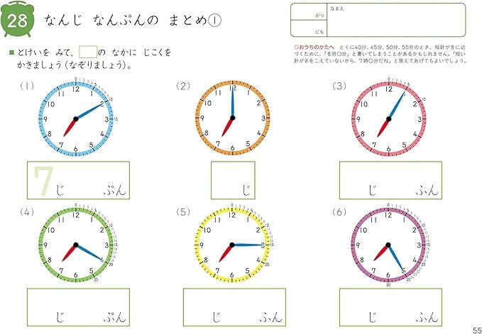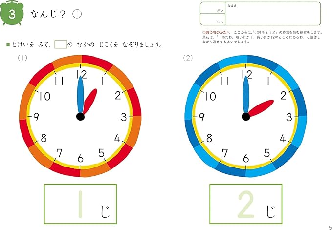 「○時ちょうど」「○時半」から、5分きざみの時刻の読みかたまでを練習します。はじめて時計の読みかたを学習するお子さまに。