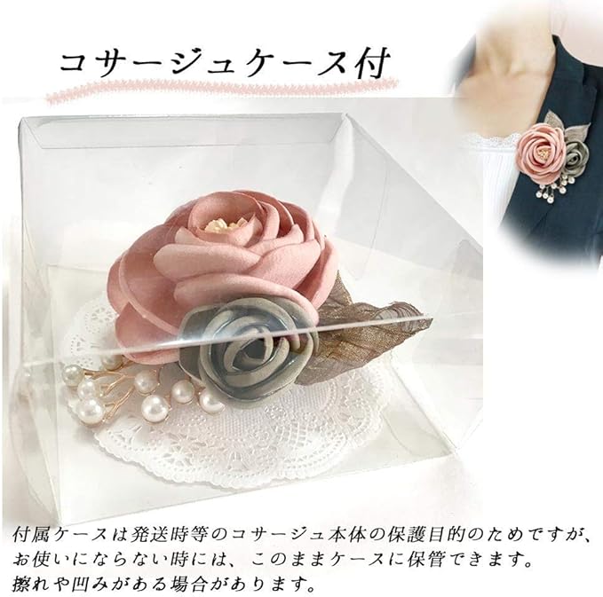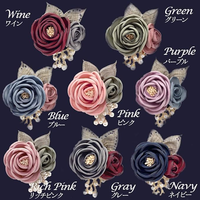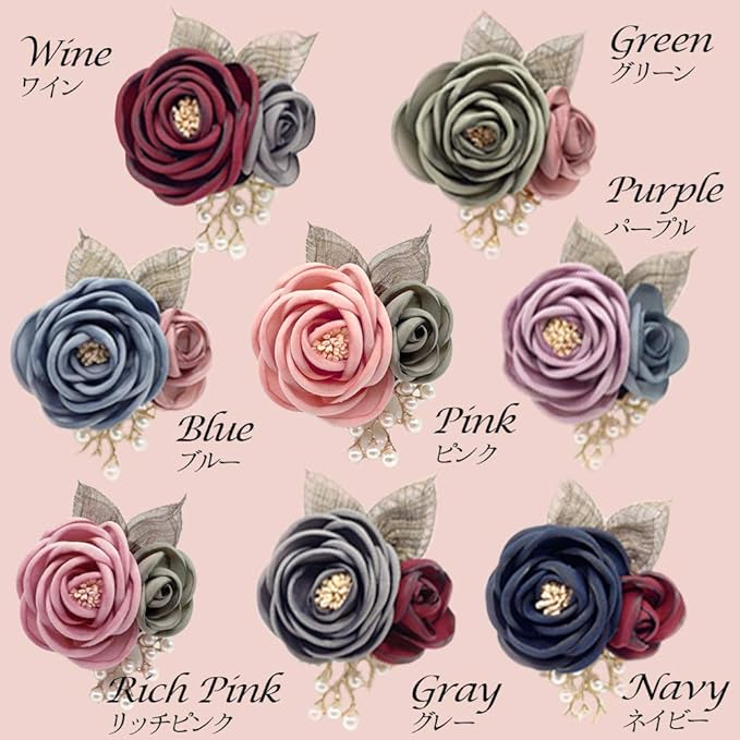 トレンドのくすみカラーで上品な印象でお洒落です。 ピンクのスーツ、紺のスーツ、グレーのスーツに似合うコサージュを探せるように背景を変えているのでごらんくださいませ