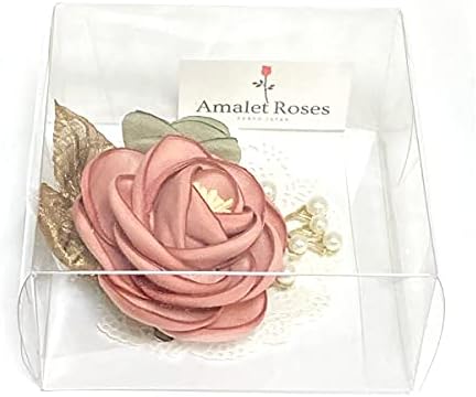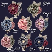 葉っぱとパールで包まれ、落ち着いた色の2つの大小のローズのお花がどんな色の洋服にもしっくりきます。また、この2つのお花の色が違うことでどんなお洋服の色にもあわせやすくなっています