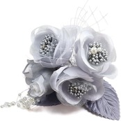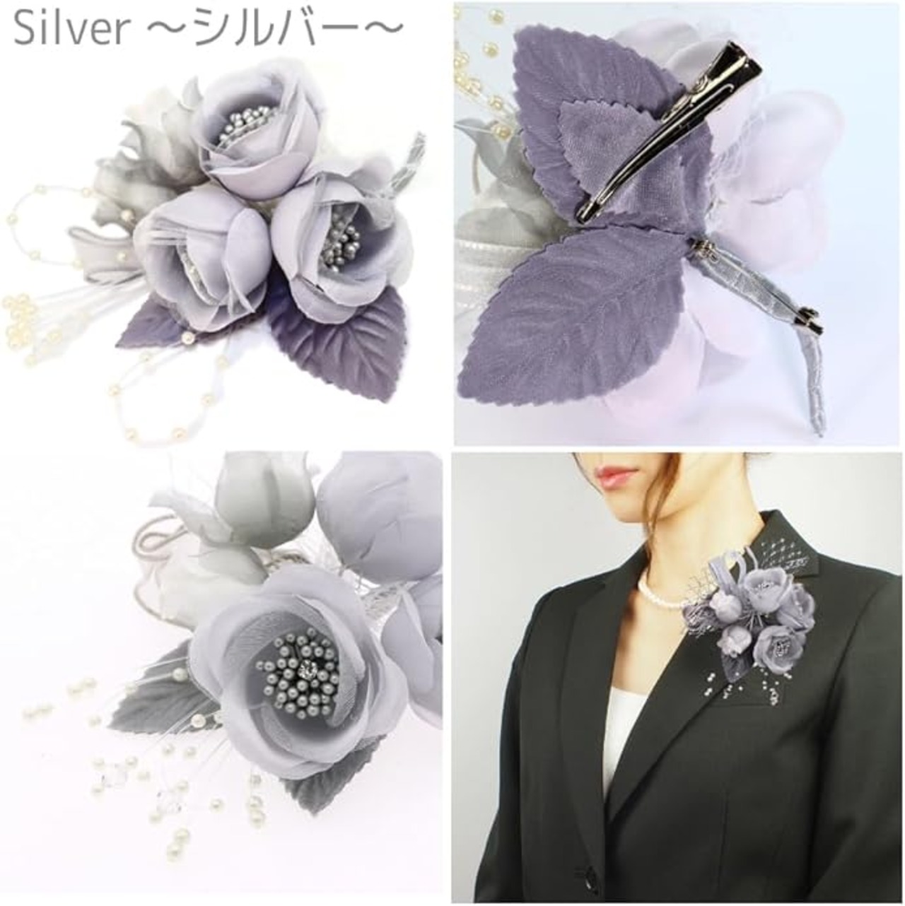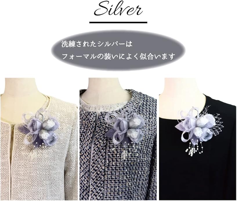 [クレインズコレクション] 手作り 三つ花ローズ コサージュ ブローチ ピン フォーマル シーンや エレガント な装いに シルバー
