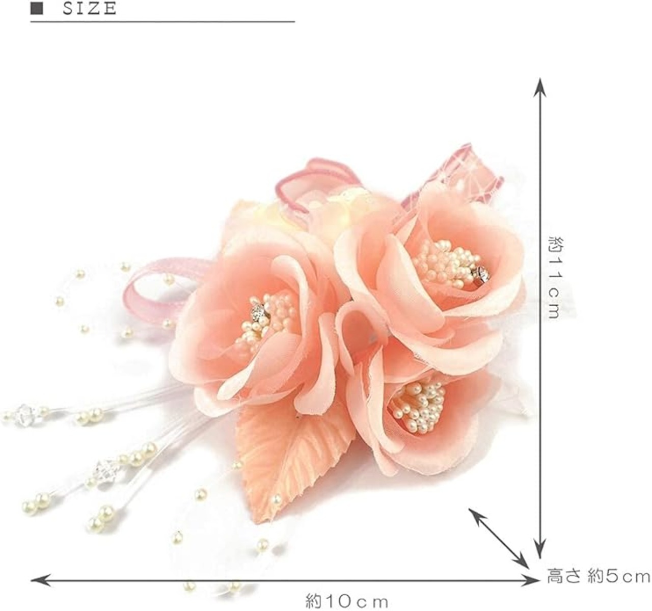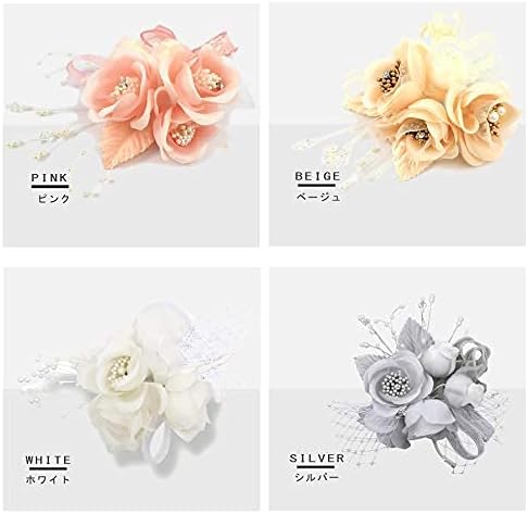 ■3つ花と2つのつぼみでエレガントに:3つの花(ローズ)に2つのつぼみをデザインし、レース、リボン、ワイヤーパールと様々なパーツを組み合わせたとても豪華でエレガントな仕上がりとなりました。