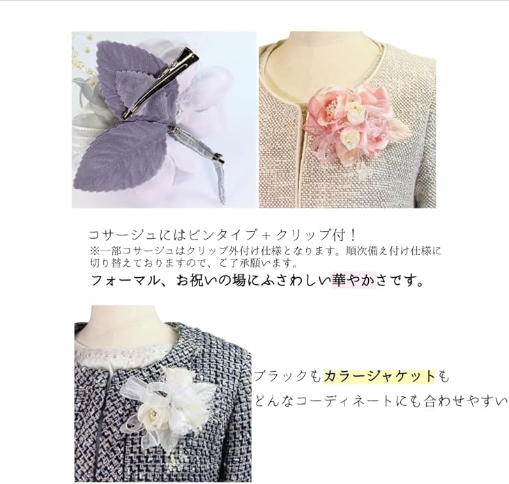■素材:合成繊維、パール、合金 ■生産地:台湾 ※金具は安全ピン+クリップの2WAYタイプです。※専用BOXケースに入れて発送いたします。
