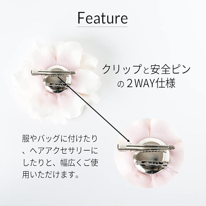 コサージュ、ヘアアクセサリーとしてとしてスーツ、ドレス、着物に合わせたり、バッグになど取り付けるアクセサリーとしてもお使いいただけます。