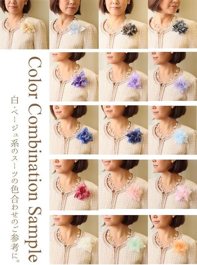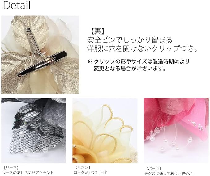 選べるカラーがたくさん! どんなフォーマルスーツにもマッチするカラー展開です。 コサージュは結婚式・入学式にご参列の方のマストアイテムの一つ。 [鎌倉工芸]のコサージュは控えめだけど華やかな印象を残す「晴れの日の魔法」 あなたが使う日を想像しながら、手作業で丁寧に一つ一つの作業を行っています。 今まで子育てを頑張ってくれた奥様へ、お子様の卒業式の日に感謝の気持ちを込めてコサージュを贈る旦那様も増えてきました。 このコサージュに別売のクリップをつけると、お召し物を傷つけずにつけていただくことができます。 ※この商品は手染めです。水濡れをしますと移染を起こす場合があります。 ※すべての工程が手作業のため、商品によって若干の誤差が生じる場合があります。