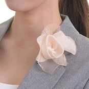 ジャケットの襟などに安全ピンで固定する場合、薄手のジャケットですとコサージュが安定しない場合があります。その際は襟の裏に厚手、やや硬めの生地を当て布して頂きますと安定します。洋服にピンを通したくない方向けにクリップを別売りしています。