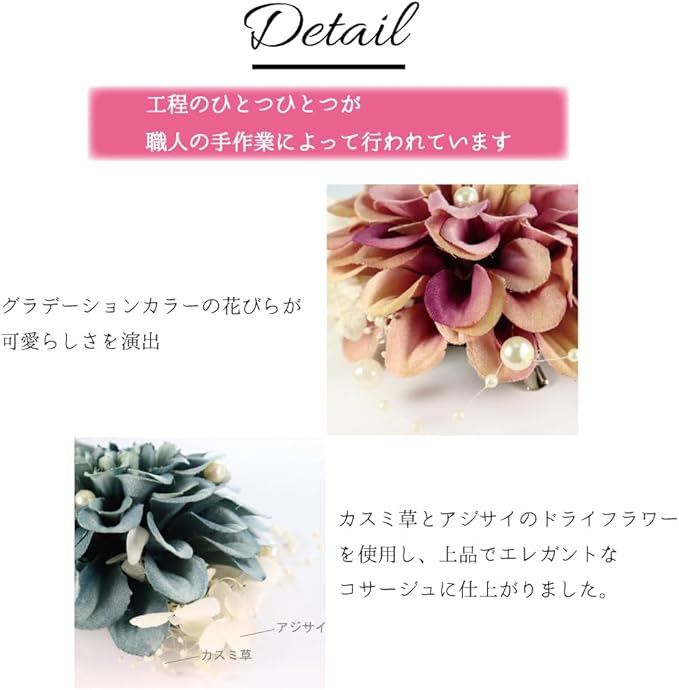 ■日本製の手作りコサージュ:この商品は日本の職人がひとつひとつ丁寧に仕上げた手作りコサージュです。