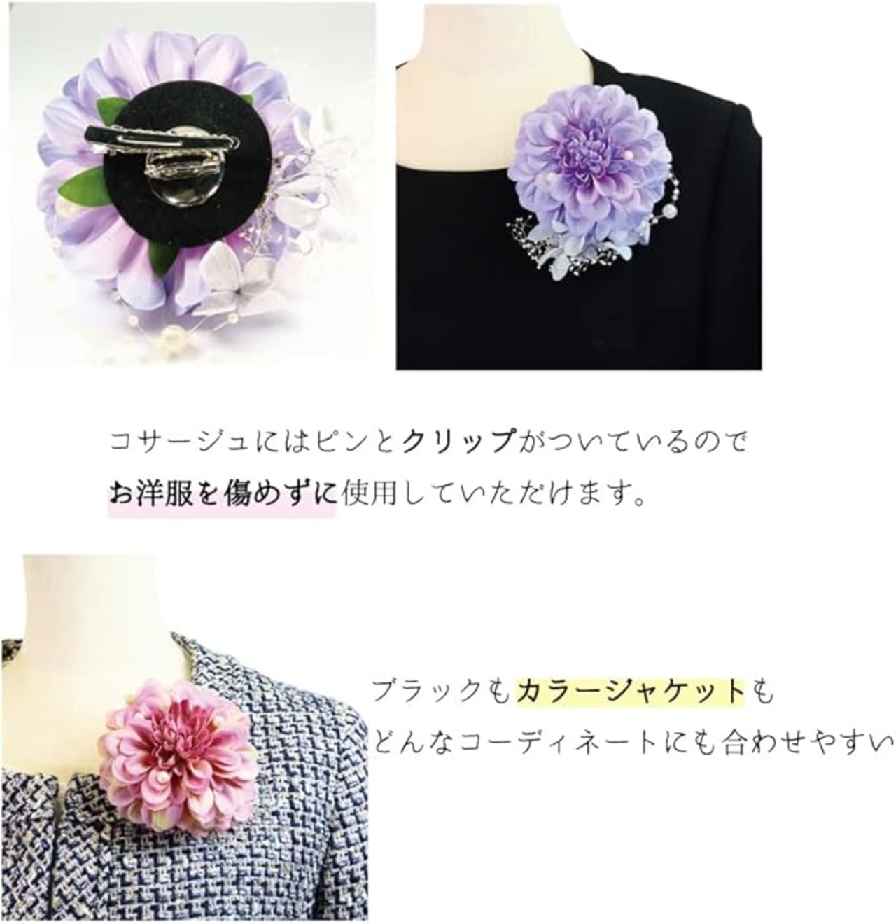 [クレインズコレクション] 日本製 ダリア コサージュ カスミ草 あじさい ブローチ クリップ ピン 2WAY フォーマル 入学式 卒業式 結婚式 ハレの日の特別なシーンに