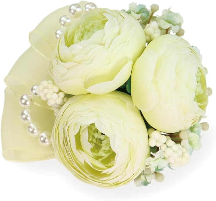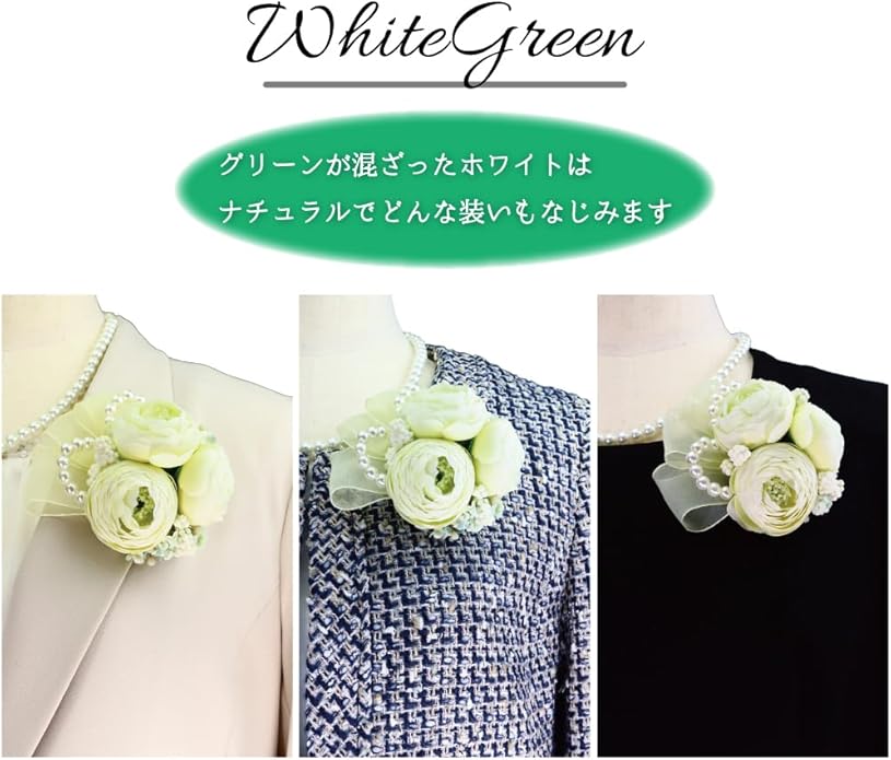 [クレインズコレクション] 日本製 三つ花ラナンキュラス コサージュ ブローチ クリップ 2WAY フォーマル 入学式 卒業式 入園式 卒園式 結婚式 発表会 演奏会 パール & リボン 自社生産 (ホワイトグリーン)