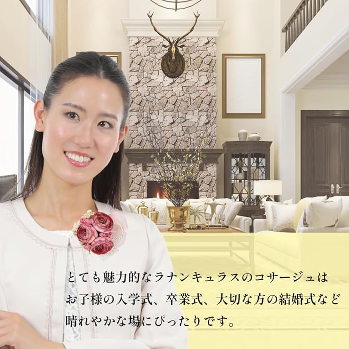 ■かわいい三つ花のラナンキュラス:グラデーションのラナンキュラスをメインに小花とヘップをあしらったコサージュです。ワイヤーパールとオーガンジーリボンをアクセントに可愛らしく仕上がったコサージュです。あえてラメ装飾をせず、落ち着いたナチュラルなお色味が胸元を華やかに彩ります。