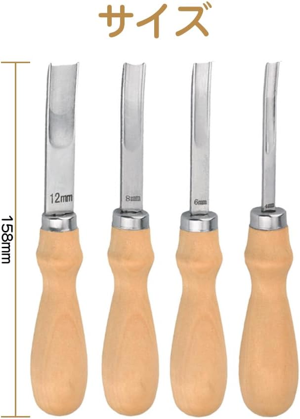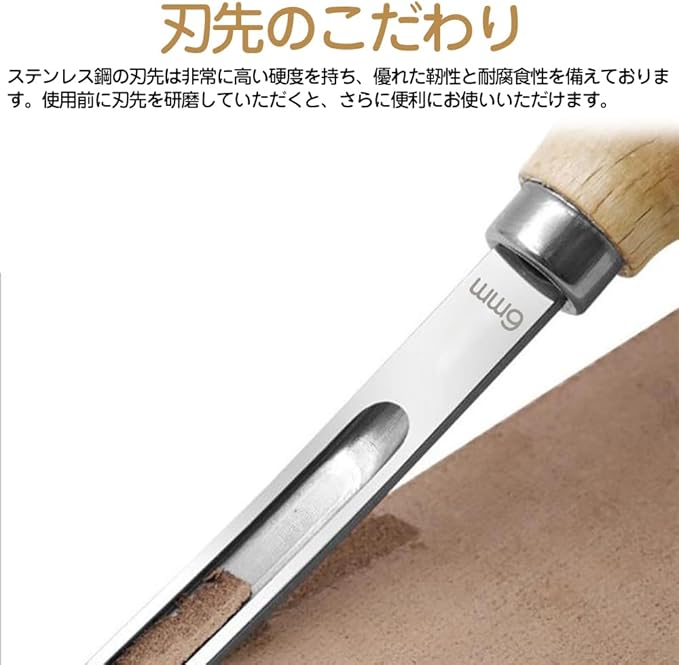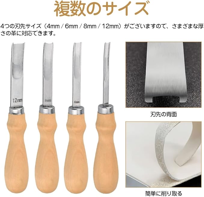 複数のサイズ:4つの刃先サイズ(4mm / 6mm / 8mm / 12mm)がございますので、さまざまな厚さの革に対応できます。