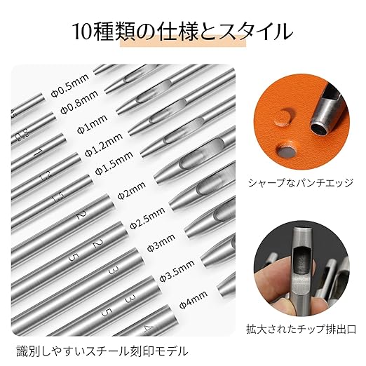 ✔【 10種類のサイズで多用途に対応 】0.5mmから4mmまでの10種類の穴径をセットでご提供。皮革、ベルト、プラスチック、ゴム、紙など、さまざまな素材に最適なサイズを選べます。DIYプロジェクトや日常の修理作業に幅広く活用可能です。