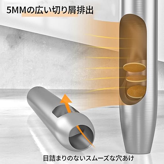 【 詰まり防止設計で作業がスムーズ 】廃材をスムーズに排出する独自の設計を採用。作業中に詰まることなく、連続して穴あけが可能です。効率的な作業が実現でき、時間と手間を大幅に削減します。