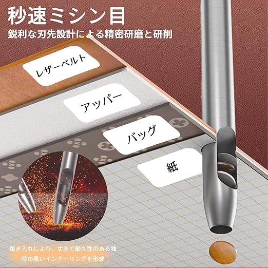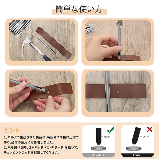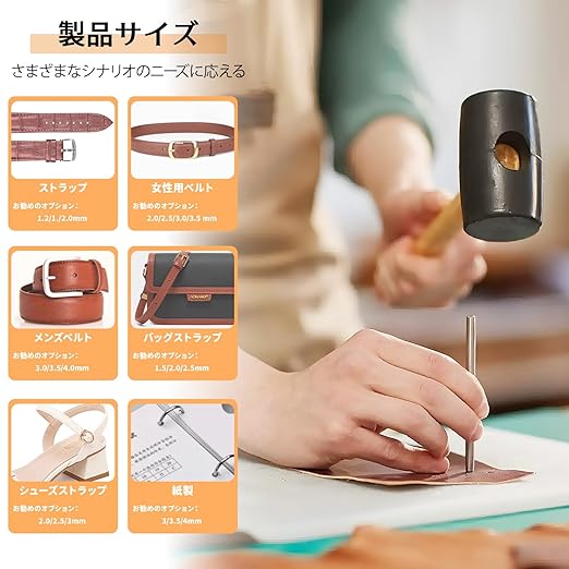 【 初心者でも簡単に使える操作性 】各パンチには明確な寸法の目盛りが付いており、初心者でも簡単にサイズを確認できます。革や素材に垂直に置き、ハンマーで軽く叩くだけで、正確な穴を開けることが可能。プロ級の仕上がりを手軽に実現します。
