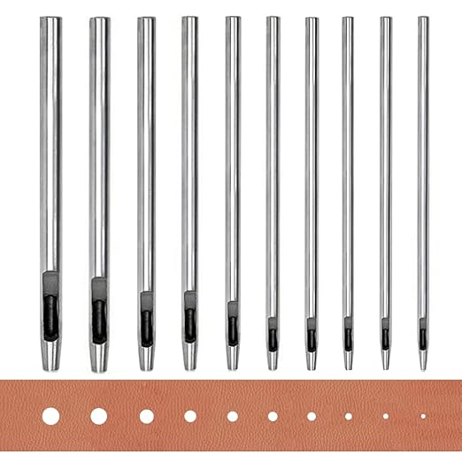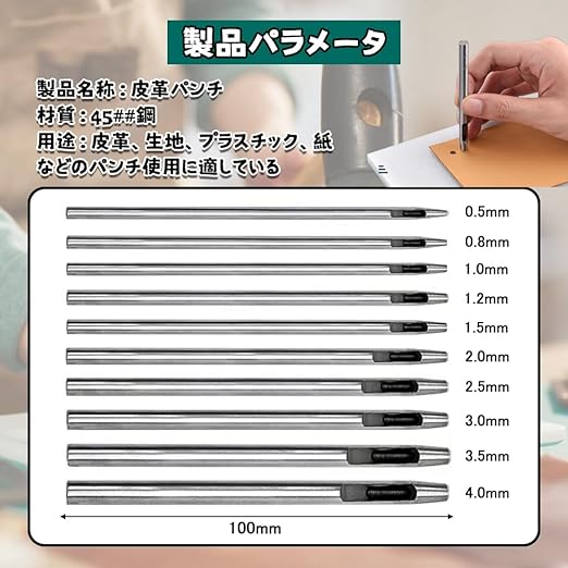 皮革パンチの長さは10センチで、10種類の異なる孔径(0.5 mm、0.8 mm、1 mm、1.2 mm、1.5 mm、2 mm、2.5 mm、3 mm、3.5 mm、4 mm)を提供し