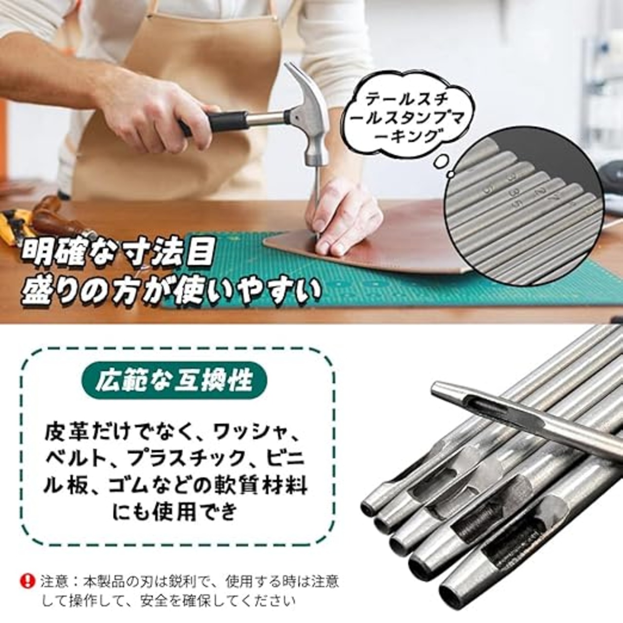 【広範な互換性】皮革だけでなく、ワッシャ、ベルト、プラスチック、ビニル板、ゴムなどの軟質材料にも使用でき、多種のDIYと修復の需要を満たす。(注意:本製品の刃は鋭利で、使用する時は注意して操作して、安全を確保してください。)