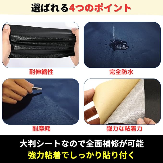 【貼るだけ簡単、即リペア】「お気に入りのソファがボロボロ…。買い替え費用を考えると頭が痛い」そんな時は合皮補修シートで修理可能です。強力接着のレザー補修シートで、貼るだけで新品のような仕上がり。伸び縮みする柔軟素材だから、角や曲面にもきれいに密着します。貼るだけで、まるで新品のような仕上がり。もう高い修理代はいりません。今すぐ、おうちの革製品をよみがえらせましょう。