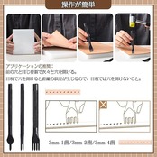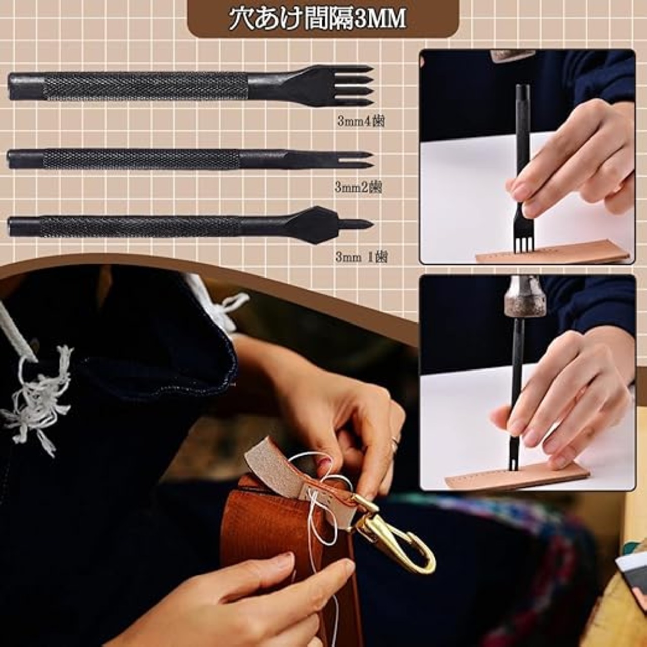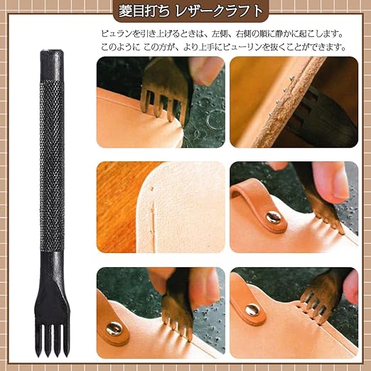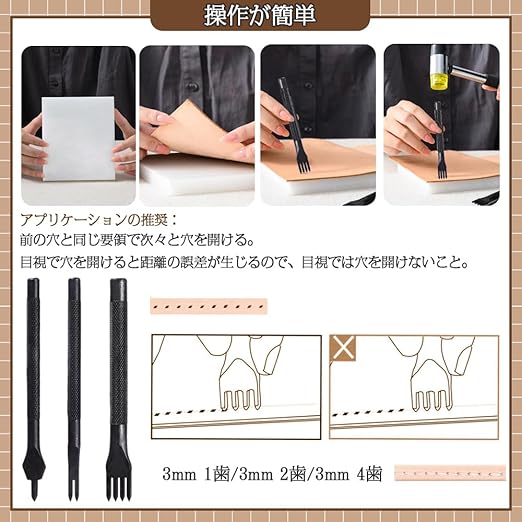 セット内容:菱形穿孔穴あけ工具3本セット(3mm1歯/3mm2歯/3mm4歯);歯の間隔 :3mm;素材:ハイカーボンスチール;カラー:ブラック;菱形穿孔は、革製品の手縫いに最もよく使われる工具。前の穴と同じ要領で次々と穴を開ける。目視で穴を開けると距離の誤差が生じるので、目視では穴を開けないこと。
