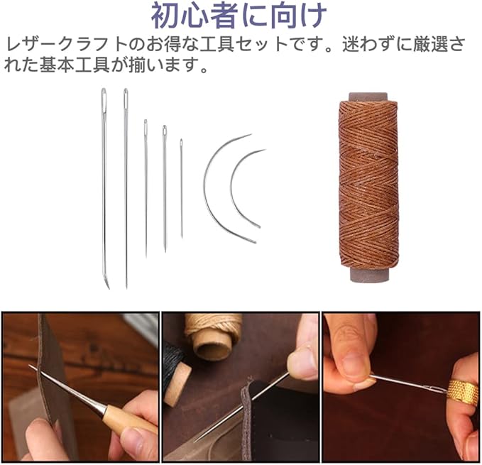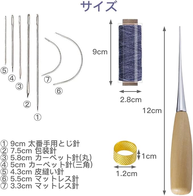 ★セット内容:蝋引き糸*6、 手縫い針*7、 千枚通し*1、 シンブル(指貫)*1。
