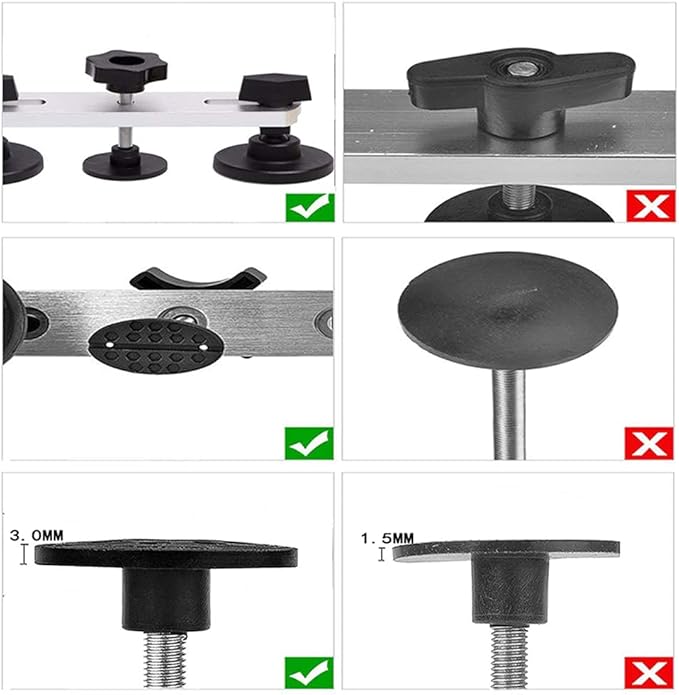 注意事項:大き過ぎる凹み、小さすぎる凹み、鋭角についている凹み、プレスラインにかかっている凹み等に関しては修復不可な場合がございます。これはDIY修理工具で100%完全な修復を保証されていませんが、作業方法と個人的原因によって、修復効果も違います.
