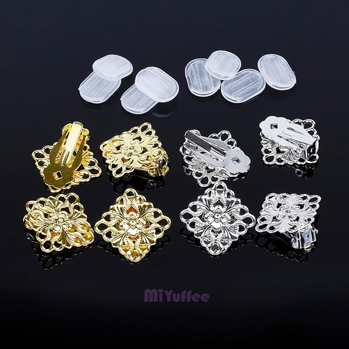 四角台座・透かしパーツ付きのイヤリングクリップとシリコンカバーのセットです。ビジューやパールやビーズなどで華やかなイヤリングを手作りしたり、耳たぶに挟むように使うタイプのイヤリングを作成するためのハンドメイド用金具です。